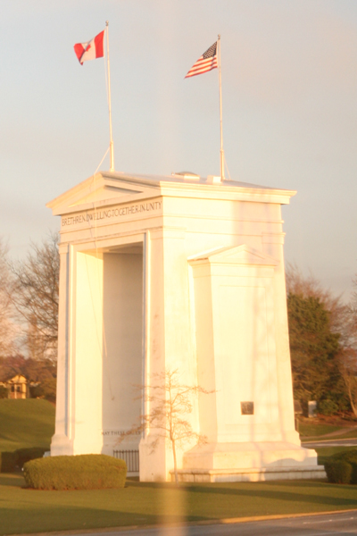 だいぶ日が傾いた頃、国境を通過。行きに撮り逃したピースアーチ(Peace Arch)を写真に収める。その後少し行った所で停車。行き違いだろうか。外は暗くなり始め、眠気が出てきたのでうとうとしていたら、いきなり警察官っぽい制服を着たごつい黒人男性がやってきて何か一言強い口調で声をかけられた。眠りに入りかけた頭で「今"ID!"って言ったよな?パスポートを出せってことか??」とか考えてパスポートを取り出そうと動き始めたら、「早くしろ!」と言わんばかりに"Passport!"とおっしゃる。「いつ日本に帰るんだ?!」と強い口調で聞かれ、寝ぼけ眼で「セプテンバー・・・じゃない、エイプリル・セカンド」と答えると、パスポートを突き返される。なんでセプテンバーが浮かんだかは自分でもよくわからない。なんだ、国境でも検査があるのか。