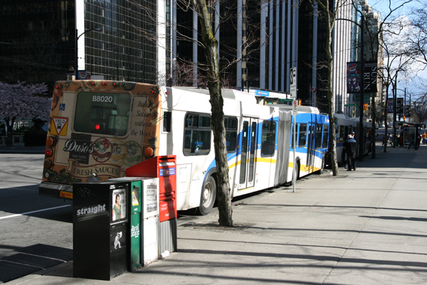 写真はなぜか後ろから撮った連接バス。シアトル同様、バンクーバーでもトロリー式連接バスをよく見かける。街灯には開催日が近い10kmマラソン、サンラン(SUNRUN)をPRする旗がぶら下がっている。後日談だが、4月20日に開催され、5万9千人が参加したそうだ。いつか参加してみたいものだ。