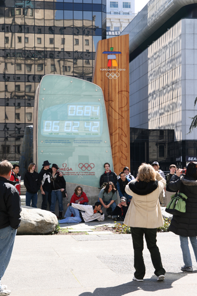 ホテル目の前の公園に、人だかりができているモニュメントがあった。北京オリンピック開催直前だが、その後の冬のオリンピックはバンクーバーで開催される。その開会式か何かまでの時間を刻んでいた。