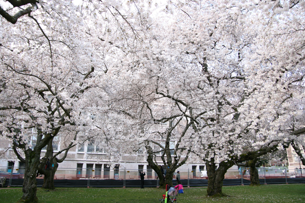 幸運にも晴れたので、シアトルの桜の名所・ワシントン大学(University of Washington)へ行くことにする。うまくいけば今回の旅行の時期に見ごろとなることが計画段階からわかっていて、ちょうど出発直前に満開になったのだ。でも雨の中行く気にはならず、行けるとしたらこの二日目の午後しかなかったので本当についていた。