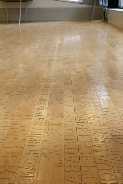 一階には、色々な言語で色々な文章の判が床になっているスペースがある。日本語もあった。「その朝、島木朗は四時に目を覚ました。」って何だろう?