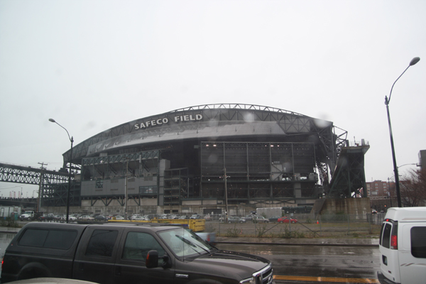 バスの乗客は私たちの他に三人ほど。天気は雪になったりみぞれになったり、ずっと悪いままだ。途中、でかいセイレーンマークのあるスターバックス本社ビル前を通る。写真を撮り損ねた。何日か後にまた来ることになる、シアトルマリナーズの本拠地・セーフコフィールド(Safeco Field)の脇も通過。