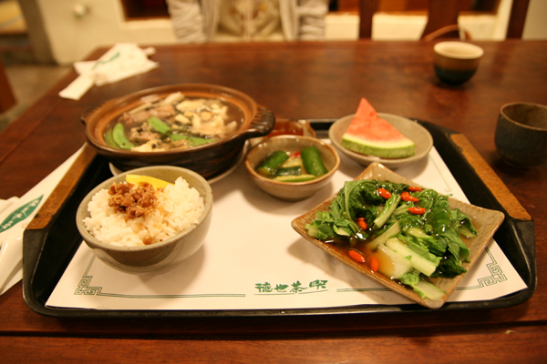 善導寺駅から徒歩三分ほどの徳也茶喫で夕食。茶葉料理、お茶の葉っぱを使った料理のお店だ。結構有名なお店のようだったので、もし満席だったら雨の中別のお店を探して歩くの嫌だなあ、と心配していた。運良く席が空いていた。料理と食後のお茶のセットを注文する。店員さんは片言の日本語を話すことができた。