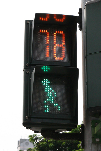 台北の歩行者用信号機の写真。下に青か赤で信号が表示され、上に信号が変わるまでの時間が出ている。下に表示されている人は、日本のように静止しているわけではなく渡れる時は歩き、残り時間が無くなってくると早足、というか駆け足になる。写真ではわからないが、なかなかかわいい。
