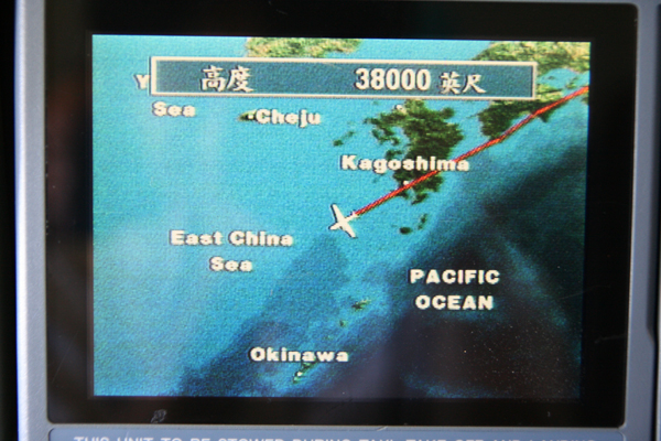 離陸後、通常の飛行コースをたどる。紀伊半島上空当たりから揺れだす。台風の影響だろうか。もっとも、食事は出せる程度。
