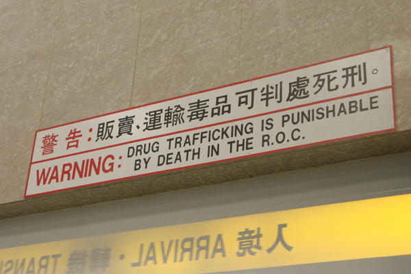 桃園国際空港に着くなりぶっそうな注意書きがお出迎え。死刑ですか。