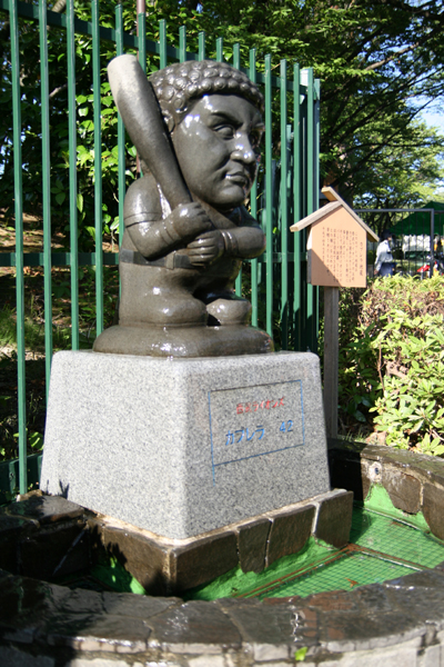 球場を出たところに「カブレラ地蔵」を発見。所沢の石材会社が寄贈したものらしい。ひしゃくで子供が水をかけて遊んでいた。