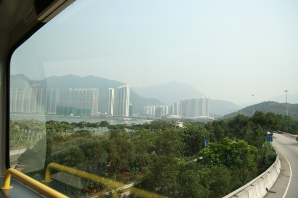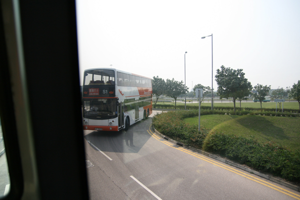 このS1系統は、空港周辺の航空会社などの施設に寄りながらMTRの東涌駅まで至る短い路線。10分弱の間隔で運行しているので、途中で何度かすれ違った。下の写真は対岸の風景。