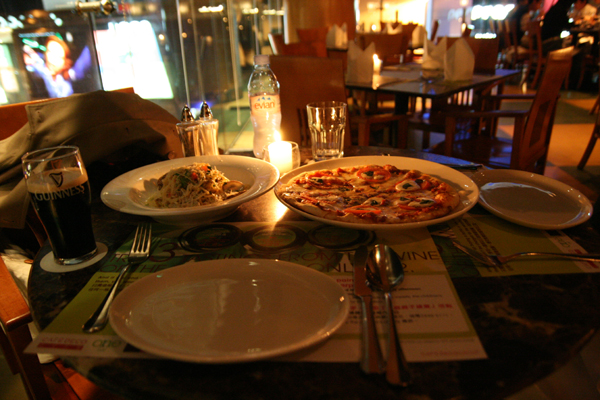 山頂に着き、まずはピークギャレリア2階のCAFE DECOで夕食。窓際はきれいな夜景を見ながら食事ができる。多分予約しないと無理だろうなあ、と思っていたが空いていたのであわよくば窓際に予約無しで座れるかも?!と期待して入店。案内されたのは窓際だったが、街が見下ろせる席ではなくピークギャレリア前の広場が見下ろせる席だった。残念ではあったが悪くない。久々のギネスに、オーソドックスなピザとパスタを注文。いずれもおいしかった。特にピザが良かった。店内は次第に込んできた。予約しないと夜景が見える窓際は難しいのだろう。
