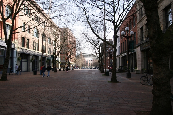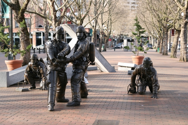 セーフコフィールドへ向かう途中、シアトル発祥の地、パイオニアスクエア(Pioneer Square)を通り過ぎる。一応シアトルでは有名な観光スポットのはずなのだが、レンガ敷きの道に葉の落ちた木々、人通りも少なく寂しい感じがする。写真は殉職した消防士の慰霊碑と像。
