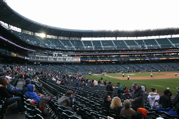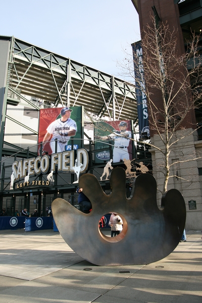 イチローと城島が所属するシアトルマリナーズ(Seattle Mariners)の本拠地、セーフコフィールド(Safeco Field)へ。この日はMLB開幕第二戦、マリナーズvsテキサスレンジャーズ(Texas Rangers)の試合を観戦する。チケットは3月初めの発売日にネットで一塁側内野席を購入。ウィルコール(WILL CALL)といって、当日に窓口でチケットを受け取る。チケット購入時には開幕戦のチケットも十分空きがあり、どうせなら開幕戦の方がよかったのだが、バンクーバーでのカナックス戦と両方見るためには仕方がなかった。
