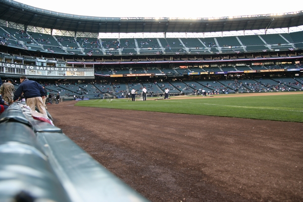 まだ試合開始一時間前、球場内は空いている。鹿か何かのマスコットにサインを求める列ができ、通路ではアメリカ軍の吹奏楽団がアトラクションを行っていた。まだ日があるのだが、既にかなり寒い。ひざ掛け毛布が必需品、という感じだ。