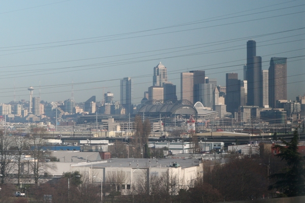 パイオニアスクエアの先、正面に見えるのはNFLシアトルシーホークス(Seattle Seahawks)の本拠地、クエストフィールド(Qwest Field)。そのさらに先に、マリナーズ戦が行われるセーフコフィールドがある。