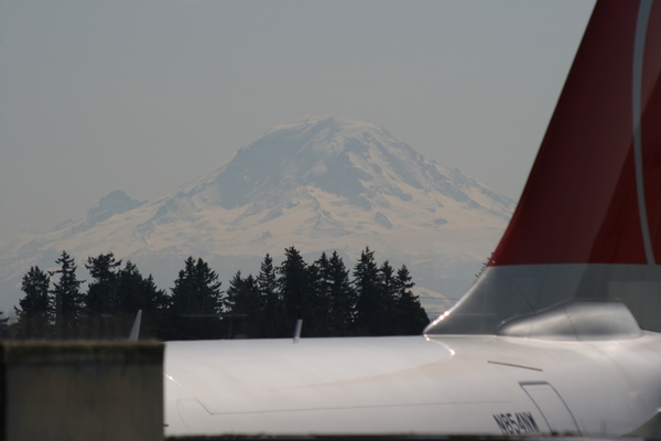 私たちの乗るユナイテッド航空より一足先に日本へ向かうノースウェスト航空。その向こうにレーニエ山(Mt. Rainier)がきれいに見える。今度シアトルへ来る時には郊外にも足を伸ばしてみたいものだ。