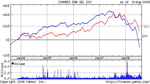 さすがにここ一年は酷いですね。ここ数年分のリターンを失ってしまっています。これは絶好の買い場なのか?!赤いラインはダウ。DVYもダウだけれども。