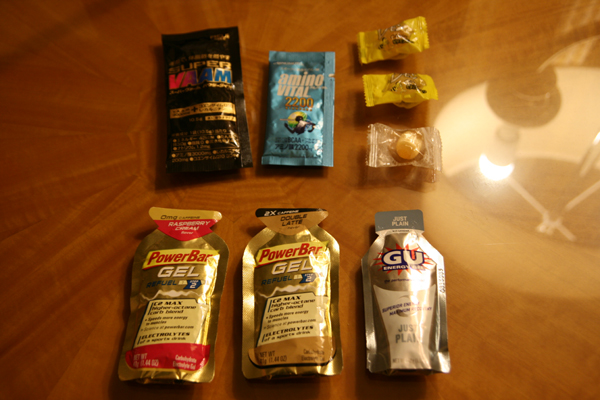 ガス欠対策として、エネルギージェルを三つ用意。日本で買うと機内持ち込み制限とか考えるのが面倒だったので、香港で調達。香港に着いてからスポーツショップをみつける度に覗いていたが、なかなか見つからない。日本出国前にアドミラルティのパシフィックプレイス内のスポーツショップで入手できるという情報を得ていたので、前日に探す。GigaSportsで18HKD(約210円)で売っているのを見つけた。パワージェル三種類とGU三種類。パワージェルのダブルラテとラズベリークリーム、GUのプレーンをチョイス。