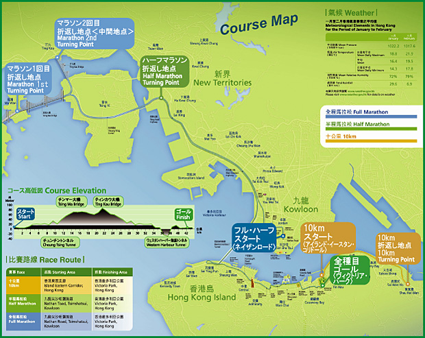 そもそもランニングを始めたきっかけが、この香港マラソンに参加するためだった。世界一長い道路鉄道併用のつり橋や、九龍から香港島へ通じる海底トンネルなど、普段歩いて立ち入れない場所に行くことができる。香港マラソンにはフルマラソンのほかに10キロの部とハーフの部がある。海底トンネルはハーフの部でも走るが、青馬大橋へはフルマラソンでないと行くことができない。高低差100メートル以上(橋の上から海底トンネルまで走るわけだから当然だ)、時間制限5時間半(※完走率97%以上の東京マラソンは制限時間7時間)と、何も準備無く臨むのは心もとない。(地図は日本事務局サイトより拝借)