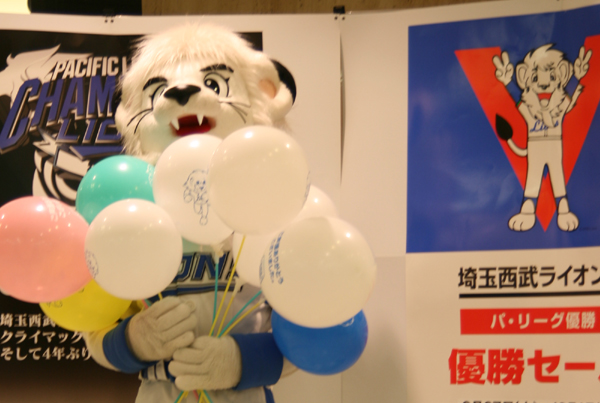 所沢西武ライオンズがパシフィックリーグ優勝を決めた翌日で、池袋の西武百貨店は優勝セール。レオとライナがやってきていたが、朝11時を過ぎたばかりでまだ小さい子供を連れた人は殆どおらず、専ら携帯電話のカメラを構える人にポーズを取るのみ。