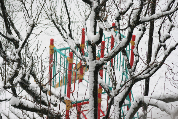 朝起きてみると、期待通り雪景色。まだ雪が降り続いている。家の前の公園では二三人の子供がはしゃいでいました。わんさか子供がいるかと思っていたけど意外。雪が止んだら遊びに出てくるのかもしれないな。