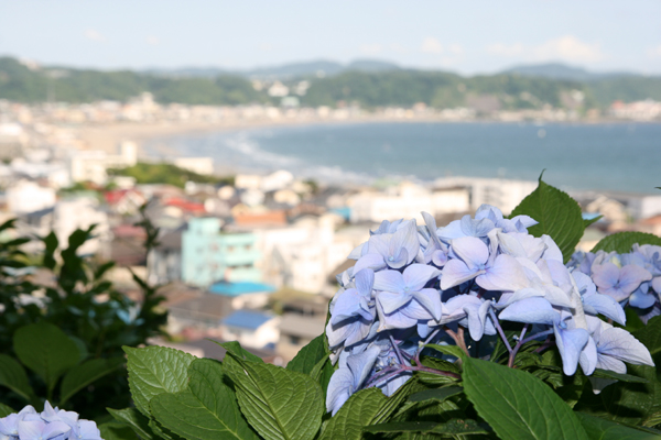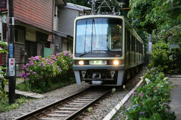 この神社のすぐ前に江ノ電の踏切があるが、ここはちょっとした撮影スポットになっているらしい。アジサイが咲くすぐ横を走る電車を撮ることができる。