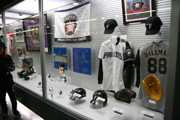 場外にはちょっとした展示コーナーがあった。ファイターズのほか、コンサドーレや著名ミュージシャンのアイテムが展示されている。連絡通路上にあるので、事前に場所を調べていかないとなかなか目にすることは無いかもしれない。