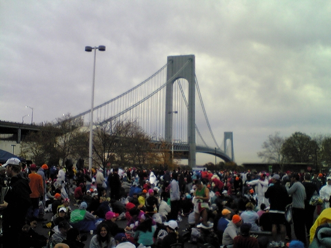 待機場所は混雑していた。スタートしてすぐ渡るベラザノ・ナローズ橋(Verrazano-Narrows Bridge)がきれいに見える。二層になっている橋で、緑ゼッケンの選手は下層を走っていくことになる。