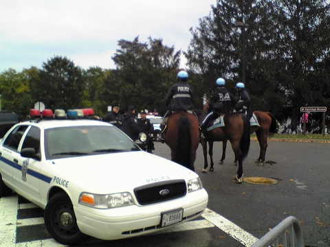スタートまでは二時間以上の待ち時間があった。無料で提供されているベーグルとパワーバー、ホットコーヒーをもらって空いているエリアを探す。一番奥のフェンスを超えると空いていたので、ウォーミングアップをしている人を眺めながらパクついた。馬に乗った警察官がパトロールしている。